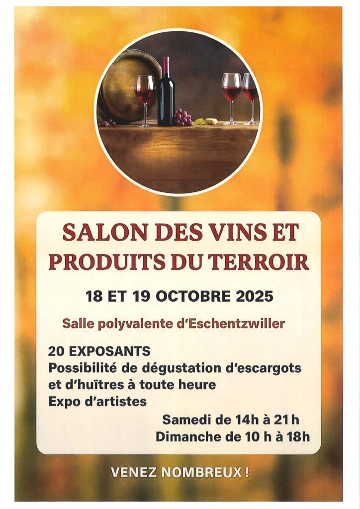Le Salon des Vins est de retour à Eschentzwiller, les 18 et 19 octobre 2025 à la Salle Polyvalente du Mühlbach!