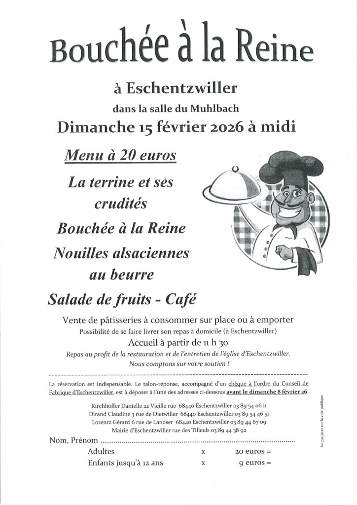 Le Conseil de Fabrique d’Eschentzwiller organise son repas Bouchée à la Reine à la salle du Muhlbach d’Eschentzwiller le dimanche 15 février 2026